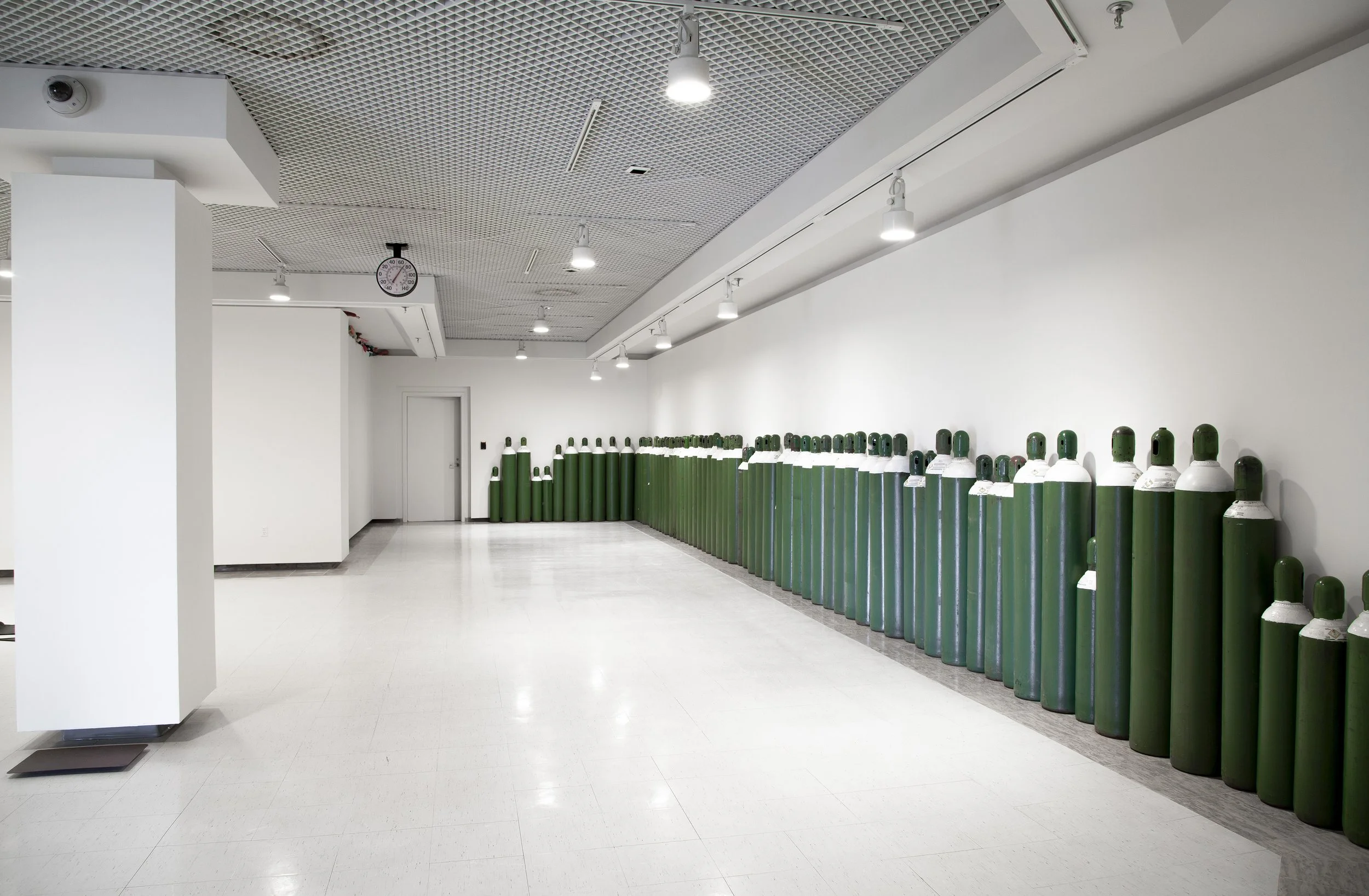 On one side of the gallery, OX M-K,S,Q (2021-22), a row of 70 medical grade oxygen tanks lines the wall. The title represents the tanks’ contents and sizing options, an impersonal product code that contrasts with both the life-saving function they serve, and the personalities they seem to easily take on. They stand in single file, human-like, with sloping shoulders and small heads; some appear bored, staring impassively ahead, while others chit-chat to one another, or scan the room. This arrangement of bodies will be familiar to those that have spent more time in lines as of late, waiting on vaccines, QR scans and capacity limits; it also calls up growing surgical backlogs. The tanks are heavy and awkward to move; when they collide, they ring out, with different sizes creating different tones. (5) Oh recorded their movement into the gallery and created chime (2022), a sound piece emanating from the darkened room the line is waiting to enter (a way out or a dead end?) The sound recalls church bells or a warning call, but it’s too random and discordant to be either. There’s no announcement to follow, no clear beginning or end, just an erratic clanging that rises, then falls, only to rise again.